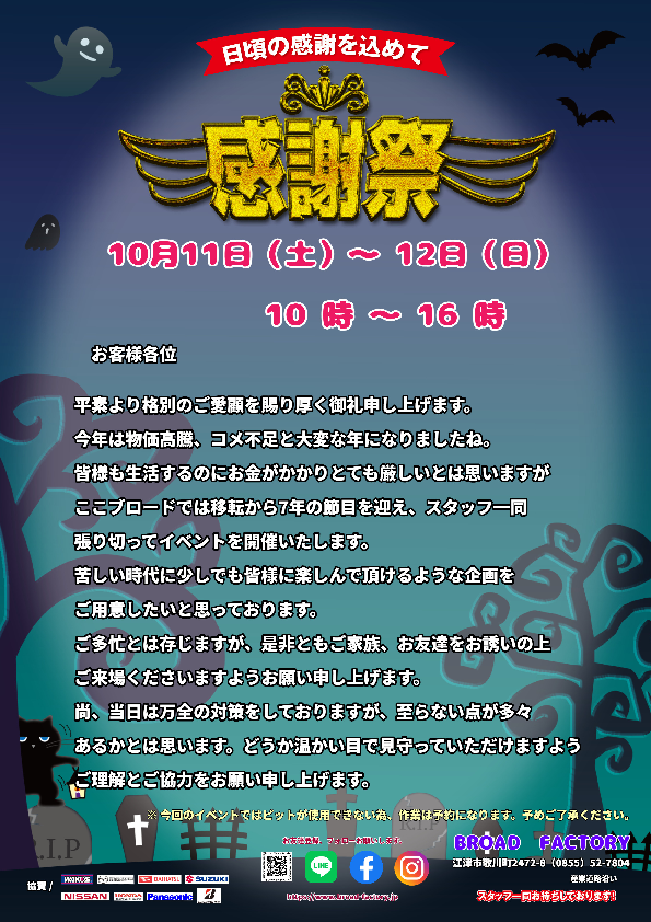 日頃のご愛顧にお応えして毎年恒例となりました「感謝祭」を10月11日、12日の両日開催致します。